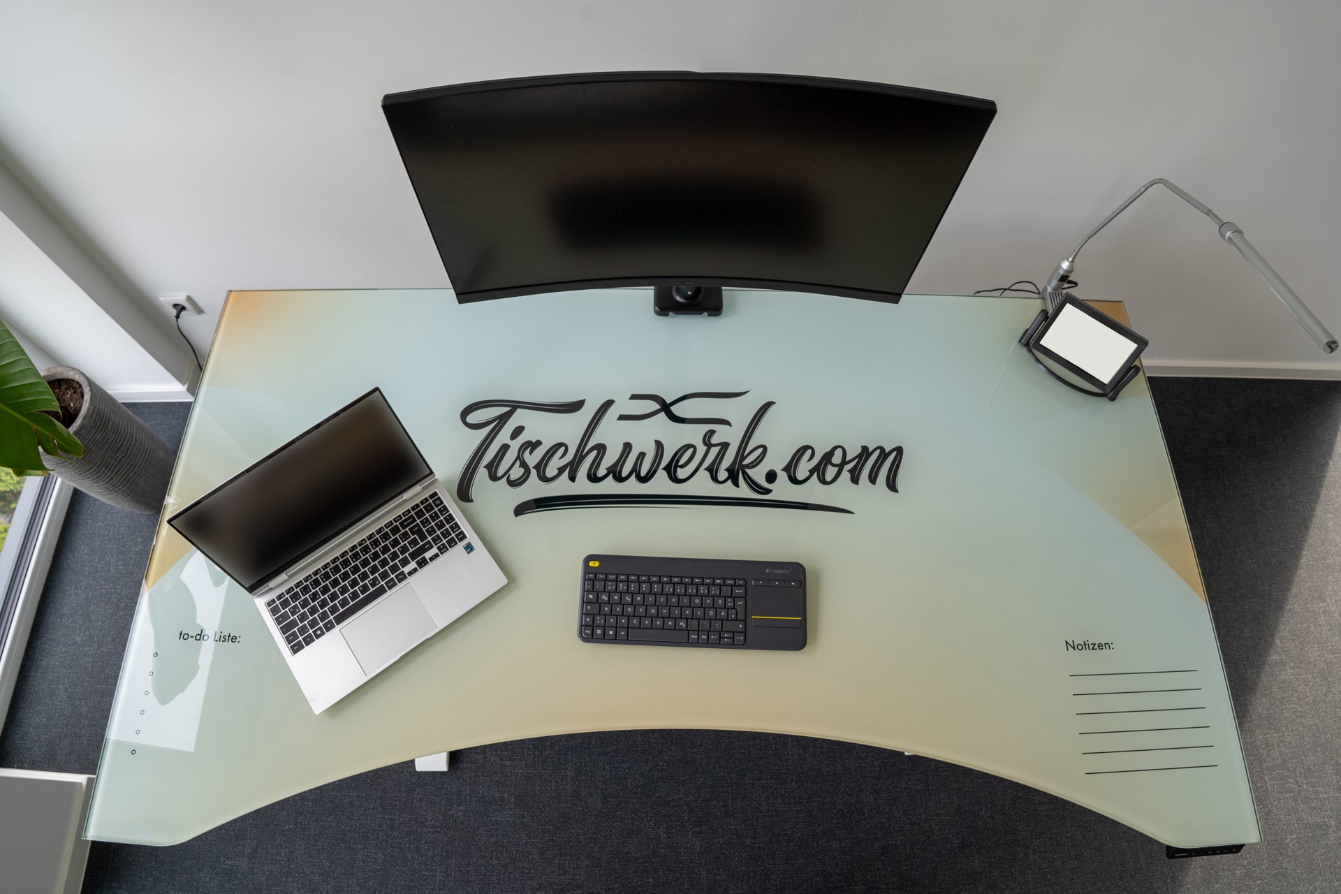 Surfer, höhenverstellbarer Schreibtisch mit individualisierbarer Glasscheibe